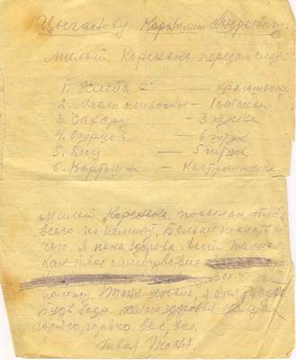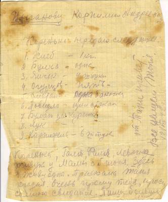 32. Опись передаваемых продуктов Мещеряковой Т.И. в тюрьму Цыганову К.А. с ее запиской и с запиской Цыгановой А.И. (между 15.10.1942 и 28.10.1942) с новостями о детях и матери.