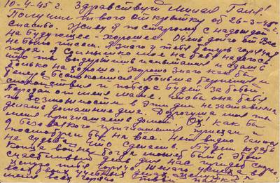 102. Письмо Цыганова К.А. от 04.03.1945 со ст. Академическая Октябрьской железной дороги (на почтовой карточке) Спириной М.И. о том, что пишет десяти адресатам, о своей благодарности за все ею сделанное для него и его семьи, о своей загруженностью работой; со штампом «Проверено военной цензурой 01766»; п/ш 07.03.1945/15.03.1945.