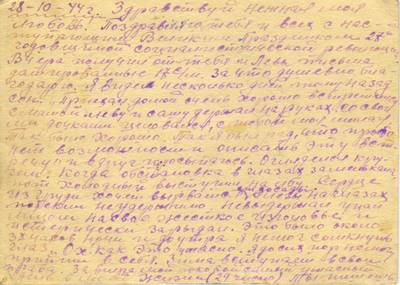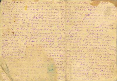 85. Письмо Цыганова К.А. от 28.10.1944 из пос. Красный Камень, г. Нижний Тагил Свердловской области (на почтовой карточке) сыну Цыганову Л.К. о беспокойстве о его здоровье и о желании быть с ними рядом; со штампом «Проверено военной цензурой 13428»; п/ш 29.10.1944/отсутств.