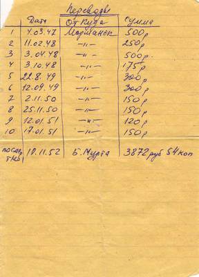 142. Список денежных переводов, отправленных Цыгановым К.А. семье из заключения с 04.03.1947 по 17.01.1951.