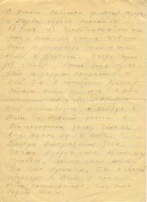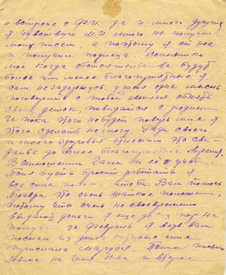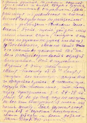 98. Письмо Цыганова К.А. от 17.12.1944 со ст. Академическая Октябрьской железной дороги Спириной М.И. о приезде для консультации его знакомых инженеров из московского Института стекла, которые были удивлены его положением и огорчены, что он им ничего не сообщал, об их высокой оценке положения на заводе и заявления начальству завода, «что консультировать Цыганова мы просто стесняемся, т. к. в этом вопросе он больше нас знает», и что обещали как-то помочь в пересмотре дела, о производственных проблемах завода и с поздравлениями с наступающим Новым годом.