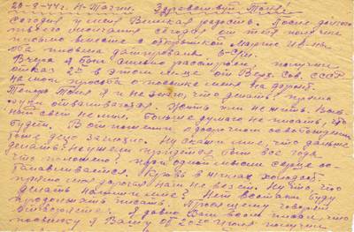 79. Письмо Цыганова К.А. от 29.09.1944 из пос. Красный Камень, г. Нижний Тагил Свердловской области, дочери Цыгановой Г.К. о том, что уже 2,5 года он находится вдалеке от семьи и пережил за это время много страшных и тяжелых дней, с благодарностью за письмо, посылку и за поздравления с днем рождения.