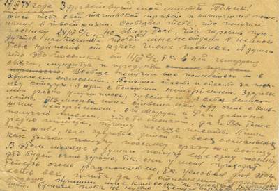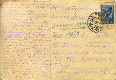 53. Письмо Цыганова К.А. от 23.03.1944 из пос. Красный Камень, г. Нижний Тагил Свердловской области (на почтовой карточке) дочери Цыгановой Г.К. с благодарностью за письма и с просьбой присылать посылки чаще и регулярнее; со штампом «Проверено военной цензурой 13447»; (п/ш нрзб/12.04.1944).
