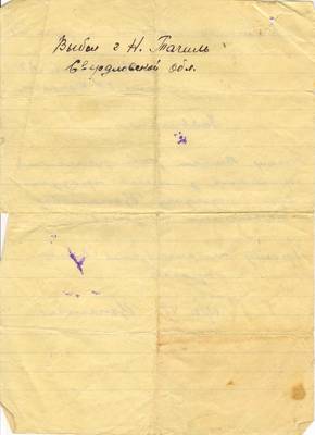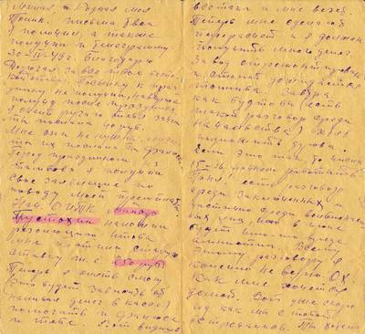 36. Письмо Цыганова К.А. от 01.02.1943 из г. Нижнего Тагила Свердловской области жене Цыгановой А.И. в Н.-Пестровку Пензенской области об отсутствии от нее писем, об этапировании 28.10.1942 и о прибытии 05.12.1942 в Тагиллаг НКВД, о работе на стройке арматурщиком, о том, насколько его положение в пензенской тюрьме было лучше, о своих тревоге за семью и о продуктах, которые нужны особенно остро; с припиской «Получено 08.03.1943 в 12 часов дня в понедельник».