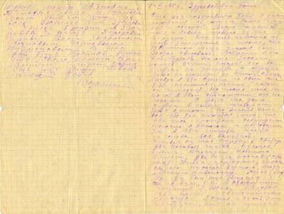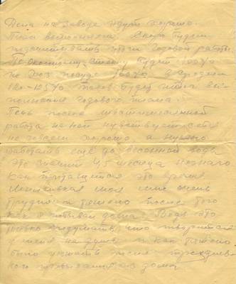 62. Письмо Цыганова К.А. от 03.06.1944 из пос. Красный Камень, г. Нижний Тагил Свердловской области, жене Цыгановой А.И. о том, что Маруся к ней приехать не сможет, так как ей отказали в пропуске, и об обещании Шуры помочь, о том, что пишет часто, но, видимо, письма теряются, об окончании работы над проектом завода и о возможной его поездке по спецнаряду в Ивановскую область, об отправке еще одного заявления, на имя Калинина М.И., об отправке на фронт, и с просьбой продолжать хлопоты по пересмотру его дела.