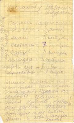 16. Опись передаваемых продуктов Цыгановой А.И. в тюрьму Цыганову К.А. с ее запиской о том, что больше передавать нечего; на обороте - приписка Цыганова К.А. от 19.08.1942 о получении передачи.