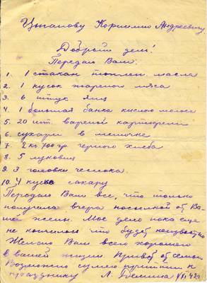 25. Опись передаваемых продуктов Цыгановой А.И. в тюрьму Цыганову К.А. с ее запиской от 12.09.1942 с поздравлениями с днем рождения.