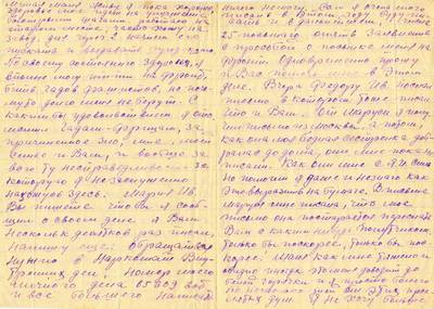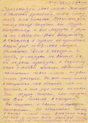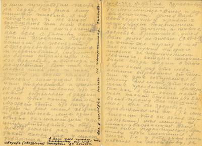 54. Письмо Цыганова К.А. от 23.03.1944 из г. Нижний Тагил Свердловской области Спириной М.И. с благодарностью за посылки, которые помогли ему укрепить здоровье и с просьбой помочь его жене в отправке заявлений во все инстанции о пересмотре его дела.