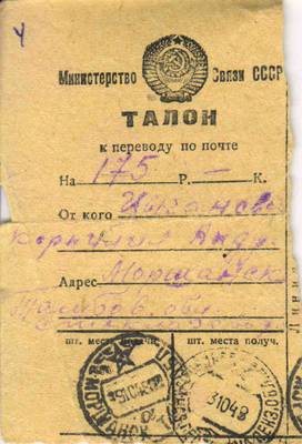 133. Талон к переводу 175 рублей от Цыганова К. А. из Моршанска Тамбовской области, стеклозавод, жене Цыгановой А.И., на обороте – письмо с извинениями, что посылает так мало и с просьбой купить на эти деньги сыновьям килограмм варенья; п/ш 03.10.1948/03.10.1948.