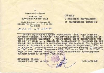 12. Справка Прокуратуры Краснодарского края № 13-1828-94 от 21.03.1995 о признании пострадавшей от политических репрессий Батовой (Цыгановой) Е.К., как оставшейся в несовершеннолетнем возрасте без попечения отца Цыганова К.А., репрессированного по политическим мотивам 16.09.1942.