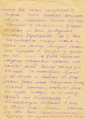 61. Фрагмент письма Цыганова К.А. от 10.05.1944 из пос. Красный Камень, г. Нижний Тагил Свердловской области, жене Цыгановой А.И. о получении ее письма, в котором сообщается о возврате посылки и об испортившихся продуктах, с советом написать жалобу в Наркомпочтель СССР на плохую работу почты, так как и его письма пропадают, и о возможном приезде к ней Маруси из Челябинска.