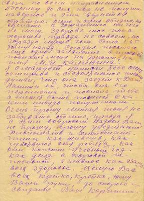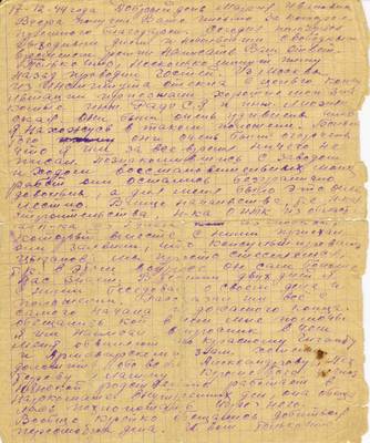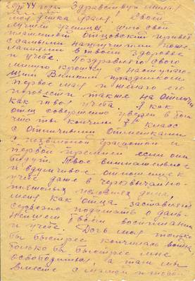 81. Фрагмент письма Цыганова К.А. от 09.10.1944 из пос. Красный Камень, г. Нижний Тагил Свердловской области, жене Цыгановой А.И. о новостях от родственников, о сожалении, что дочь Галина не может поехать учиться в Москву, как ее подруги.