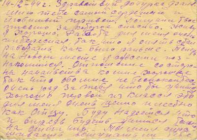 44. Письмо Цыганова К.А. от 14.01.1944 из пос. Красный Камень, г. Нижний Тагил Свердловской области, жене Цыгановой А.И. о своем новом адресе и переводе на работу в проектное бюро инженером-стекольщиком, об улучшении условий жизни, о недавнем пребывании в лазарете и слабости, о неполучении посылки, отправленной 15 декабря, о посылке, посланной знакомым; с припиской «Получено 30.01.1944».