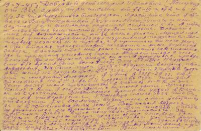 99. Письмо Цыганова К.А. от 19.01.1945 со ст. Академическая Октябрьской железной дороги (на почтовой карточке) дочери Цыгановой Г.К. о том, что его долгое молчание вызвано занятостью на работе, о получении денежного перевода от сестры, которого надолго хватит на покупку картошки и молока; со штампом «Проверено военной цензурой 01411»; п/ш 25.01.1945/09.02.1945.