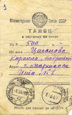 130. Талон к переводу 500 рублей от Цыганова К. А. из ИТК № 7 г. Моршанска жене Цыгановой А.И., на обороте - поздравления по поводу ее дня рождения; п/ш 04.03.1947/10.03.1947.