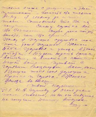 80. Письмо Цыганова К.А. от (октября 1944) из пос. Красный Камень, г. Нижний Тагил Свердловской области, жене Цыгановой А.И. о получении письма от нее и от Люси, о радости по поводу ее улучшившегося здоровья и о переживаниях из-за болезни сына и дочери.