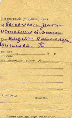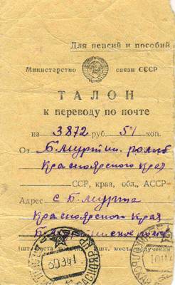 140. Талон к переводу 3872,51 рублей из пос. Большая Мурта Красноярского края Цыгановой А.И. в Пензенскую область, на обороте – письмо об отправке денег, оставшихся после смерти ее мужа Цыганова К.; п/ш 30.09.1952/10.11.1952.