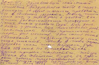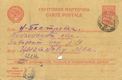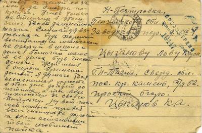 111. Письмо Цыганова К.А. от 30.04.1945 со ст. Академическая Октябрьской железной дороги (на почтовой карточке) сыну Цыганову Л.К. с вопросами о его оценках и о здоровье сестры; со штампом «Проверено военной цензурой 01777»; п/ш 03.05.1945/отсутств.