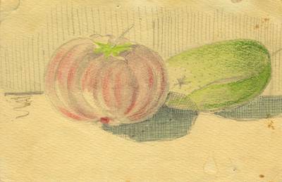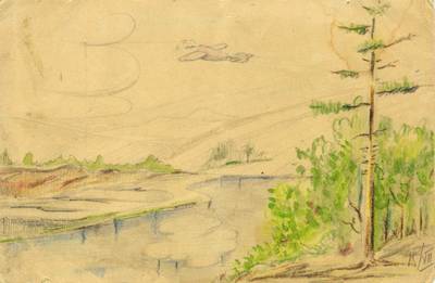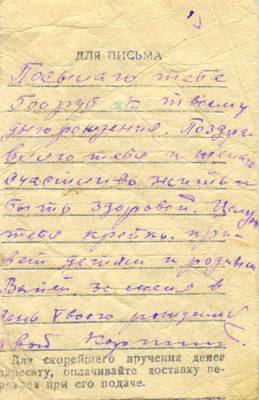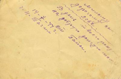 70. Самодельная открытка с рисунком карандашом, подписанная Цыгановым К.А. сыну Лёве 14.07.1944 в день его рождения, г. Нижний Тагил.