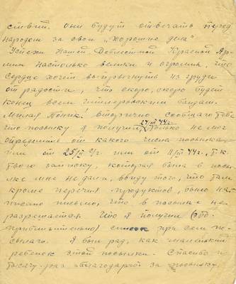 37. Копия письма Цыганова К.А. от 01.02.1943 из г. Нижнего Тагила Свердловской области жене Цыгановой А.И. в Н.-Пестровку Пензенской области об отсутствии от нее писем, об этапировании 28.10.1942 и о прибытии 05.12.1942 в Тагиллаг НКВД, о работе на стройке арматурщиком, о том, насколько его положение в пензенской тюрьме было лучше, о своих тревоге за семью и о продуктах, которые нужны особенно остро; с припиской «Получено 08.03.1943 в 12 часов дня в понедельник».