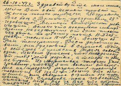 83. Письмо Цыганова К.А. от 26.10.1944 из пос. Красный Камень, г. Нижний Тагил Свердловской области, (на почтовой карточке) дочери Цыгановой Г.К. с поздравлениями с 7 ноября и о полученных новостях от родственников; со штампом «Проверено военной цензурой 18374»; п/ш 31.10.1944/отсутств.