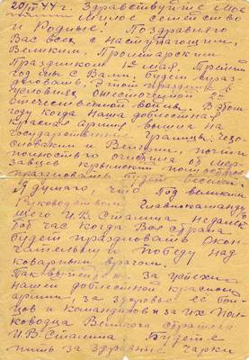 60. Письмо Цыганова К.А. от 20.04.1944 из пос. Красный Камень, г. Нижний Тагил Свердловской области, дочери Цыгановой Е.К. с поздравлениями с 1 Мая, с пожеланиями успешного окончания 7-го класса и с просьбой ко всем детям вспоминать о нем во время обеда.