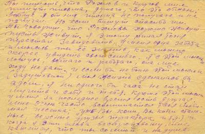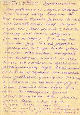 67. Письмо Цыганова К.А. от 17.06.1944 из пос. Красный Камень, г. Нижний Тагил Свердловской области Спириной М.И. о получении ее письма, о своем сне, в котором жена держит на руках сына, которого он никогда не видел, об испытанной во сне радости, и о своих рыданиях после пробуждения, об улучшении здоровья, которое позволяет ему пойти на фронт, о своих просьбах отправить его на фронт, о работе на стекольном заводе и об отправке заявлений о пересмотре дела.