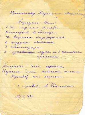 21. Опись передаваемых продуктов Цыгановой А.И. в тюрьму Цыганову К.А. с ее запиской и припиской Цыганова К.А. от 01.09.1942 о получении передачи.