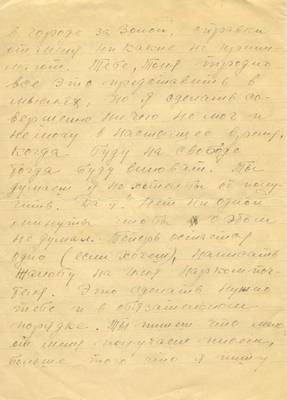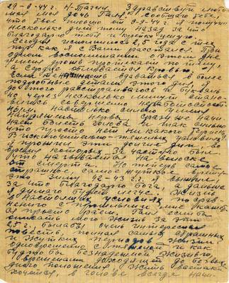 42. Письмо Цыганова К.А. от 21.06.1943 из г. Нижнего Тагила Свердловской области племяннице Люсе о получении от нее открыток, о своей работе плотником, о том, что с 16.06.1943 из-за болезни освобожден от работы, о том, что давно не получал посылок, об отправке заявлений на имя Сталина, Калинина, Берии, прокурору СССР и в НКЛП СССР.