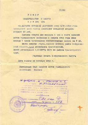 9. Нотариально заверенная копия свидетельства ВЭ № 105104 о смерти Цыганова К.А.04.06.1952 (причина смерти – рак желудка, место смерти - с. Ентауль Большемуртинского района Красноярского края), выданного 28.10.1952 Большемуртинским ЗАКС.