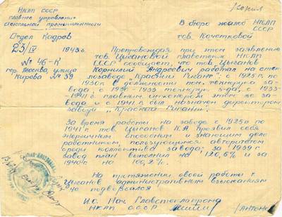 2. Заверенная копия письма и. о. начальника Главпромстекла НКЛП СССР № 46-К от 23.04.1943 в Бюро жалоб НКПЛ СССР об отправке заявления Цыгановой А.И. и с характеристикой на Цыганова К.А., работавшего на стеклозаводе «Красный гигант» с 1925 по 1941 г., в т. ч., на должности директора, и проявившего себя энергичным и знающим дело работником.