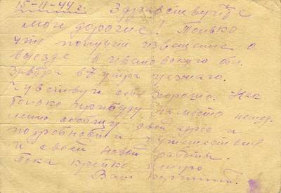 93. Письмо Цыганова К.А. от 26.11.1944 со ст. Академическая Октябрьской железной дороги жене Цыгановой А.И. о приезде 26 ноября на новое место работы – на восстановление Борисовского стекольного завода в окрестностях станции Бологое, который надо запустить в эксплуатацию 01.01.1945, о своем самочувствии и надеждах.
