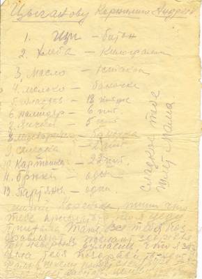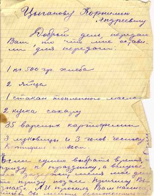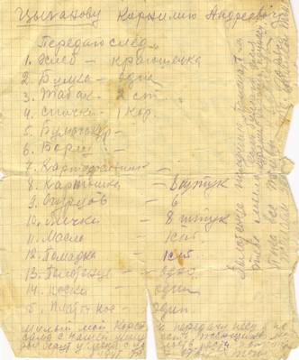 13. Опись передаваемых продуктов Цыгановой А.И. в тюрьму мужу Цыганову К.А., на обороте - сообщение о рождении 28.07.1942 сына Шурика и приписка Цыганова К.А. от 06.08.1942 о получении передачи.