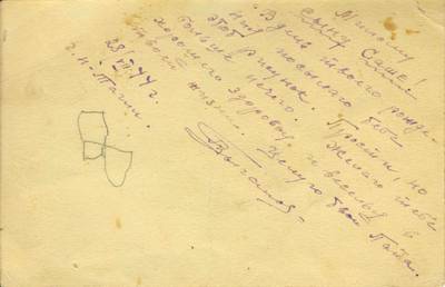73. Самодельная открытка с рисунком карандашом, подписанная Цыгановым К.А. сыну Саше 28.07.1944 в день его рождения, г. Нижний Тагил.