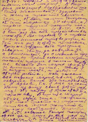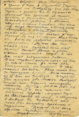 76. Письмо Цыганова К.А. от 10.09.1944 из пос. Красный Камень, г. Нижний Тагил Свердловской области, жене Цыгановой А.И. и детям о получении письма от сына Лёвы, о смерти в лазарете товарища и коллеги, которому скоро предстояло освободиться, и о том, что нужно сообщить семье, а у него нет на это сил.