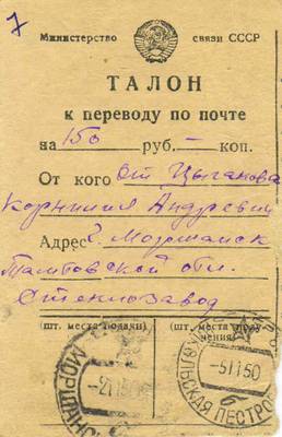 137. Талон к переводу 150 рублей от Цыганова К. А. из Моршанска Тамбовской области, стеклозавод, жене Цыгановой А.И., на обороте – письмо о переводе дочери 250 рублей; п/ш 25.11.1950/отсутств.