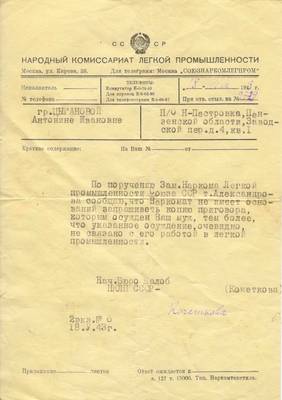 1. Копия письма и. о. начальника Главпромстекла НКЛП СССР № 46-К от 23.04.1943 в Бюро жалоб НКПЛ СССР об отправке заявления Цыгановой А.И. и о том, что Цыганов К.А. работал на стеклозаводе «Красный гигант» с 1925 по 1941 г., в т. ч., в должности директора, и проявил себя энергичным и знающим дело работником.