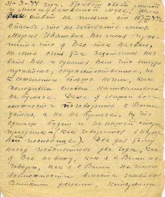 58. Письмо Цыганова К.А. от 31.03.1944 из пос. Красный Камень, г. Нижний Тагил Свердловской области, Спириной М.И. о том, что прошло ровно два года с момента его ареста, о получении посылки и с просьбой прислать к 1 Мая что-нибудь вкусное.