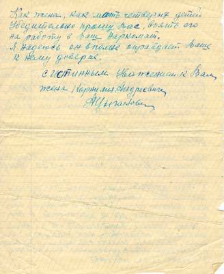 3. Письмо Цыгановой А.И. от [1943 г.] на имя сослуживца мужа Григория Васильевича с просьбой ходатайствовать об освобождении Цыганова К.А. как специалиста стекольной промышленности и о принятии его на работу в наркомат, с приложением характеристики НКПЛ СССР стекольной промышленности № 46-К от 23.04.1943 на Цыганова К.А.