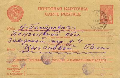 115. Письмо Цыганова К.А. от 25.05.1945 со ст. Академическая Октябрьской железной дороги (на почтовой карточке) жене Цыгановой А.И. о получении четырех писем, о том, что ей не следует приезжать к нему на свидание с сыном Шурой, так как дорога тяжелая, и о беспокойстве за здоровье дочери Фали; со штампом «Проверено военной цензурой 01754»; п/ш 27.05.1945/отсутств.