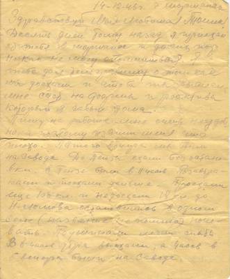128. Письмо Цыганова К.А. от 14.12.1946 из г. Моршанска Тамбовской области жене Цыгановой А.И. о том, что 10 дней назад он вернулся от нее в Моршанск и до сих пор не может опомниться от проведенных дома трех дней, о хорошей работе завода и о выполнении плана, о написании заявлений на пересмотр его дела.