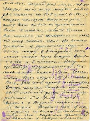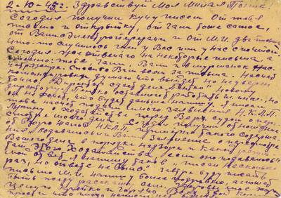 82. Письмо Цыганова К.А. от 15.10.1944 из пос. Красный Камень, г. Нижний Тагил Свердловской области Спириной М.И. о получении ее письма и о том, что он много и часто пишет, 1-2 письма «во все концы» каждые два дня, когда становится особенно тяжело.