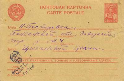 38. Письмо Цыганова К.А. от 20.02.1943 из г. Нижнего Тагила Свердловской области жене Цыгановой А.И. в Н.-Пестровку Пензенской области о том, что уже на 7 или 8 его писем нет ответа, о его беспокойстве, о жизни в лагере, о работе землекопом и с просьбой прислать посылку; с припиской «Это получено в 2 часа дня 07.03.1943, воскресенье»; конверт на имя Мещеряковой Т.И., п/ш 03.04.1943/нрзб, со штампом «Проверено военной цензурой 13431».