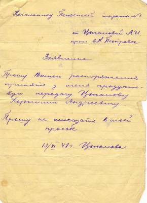 35. Заявление Цыгановой А.И. от 13.11.1942 начальнику Пензенской тюрьмы № 1 с просьбой распорядиться о принятии продуктовой передачи для Цыганова К.А.; на обороте – приписка «Выбыл г. Н. Тагил Свердловской обл.».