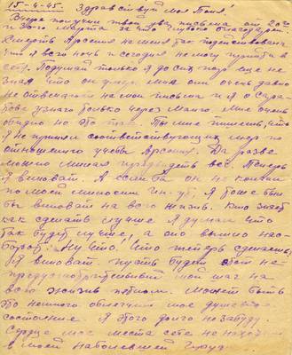 65. Письмо Цыганова К.А. от 13.06.1944 из пос. Красный Камень, г. Нижний Тагил Свердловской области, сыну Цыганову Л.К. о полученном письме, о неосуществленном желании послать свой портрет к дню рождения сына - из-за высокой цены, требуемой художником, и с поздравлениями с наступающим 12 июля днем рождения.