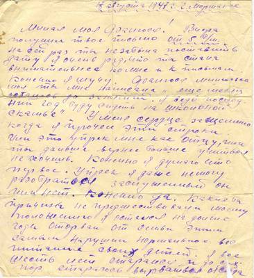 66. Письмо Цыганова К.А. от 15.06.1944 из пос. Красный Камень, г. Нижний Тагил Свердловской области, жене Цыгановой А.И. о получении письма с фотографиями детей и о своей радости по этому поводу, потому что предыдущую семейную фотографию у него украли в прошлом году в лазарете, о том, что мама обещает приехать к нему со старшим сыном, а он боится это встречи, так как может не выдержать слабое сердце, о том, что нужные данные по своему приговору он передал в письменном виде Марусе во время свидания, но Маруся приехать к его семье не смогла, поэтому надо как-то получить эту информацию для дальнейших ходатайств о пересмотре дела.