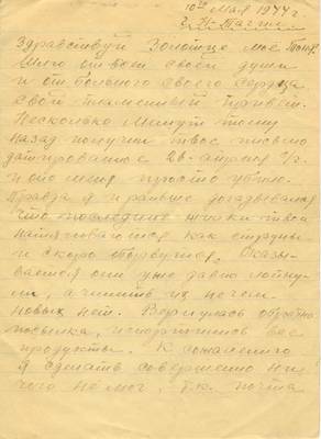 40. Копия письма Цыганова К.А. от 14.03.1943 из г. Нижнего Тагила Свердловской области жене Цыгановой А.И. с поздравлением с днем ее рождения, о своем беспокойстве из-за отсутствия писем; о сожалениях, что не был ласков и внимателен к ней, о своей любви и надеждах на возвращение; с припиской жены: «Получила 01.04.1943».
