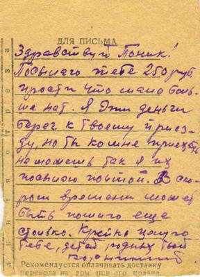 131. Талон к переводу 250 рублей от Цыганова К. А. из Моршанского стеклозавода, ИТК № 7, жене Цыгановой А.И., на обороте – письмо о том, что вскоре постарается прислать еще; п/ш 11.02.1948/16.02.1948.