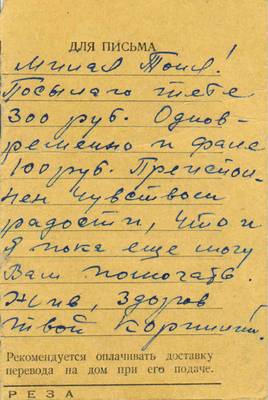 135. Талон к переводу 300 рублей от Цыганова К. А. из Моршанска Тамбовской области, стеклозавод, жене Цыгановой А.И., на обороте – письмо о переводе дочери 100 рублей и своей радости от того, что пока еще может помогать; п/ш 12.09.1949/15.09.1949.