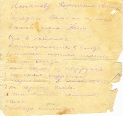 19. Опись передаваемых продуктов Цыгановой А.И. в тюрьму Цыганову К.А. с ее запиской, на обороте - приписка Цыганова К.А. от 24.08.1942 о получении передачи и с просьбой прислать табак.